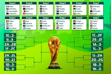 Skupina A: Meksiko, Južna Afrika, Južna Koreja, pobjednik europskog doigravanja. Skupina D.Skupina B: Kanada, pobjednik europskog doigravanja. Skupina A, Katar, Švicarska.Skupina C: Brazil, Maroko, Haiti, Škotska.Skupina D: SAD, Paragvaj, Australija, pobjednik europskog doigravanja, Skupina C. Skupina E: Njemačka, Curaçao, Obala Bjelokosti, Ekvador. Skupina F: Nizozemska, Japan, pobjednik europskog doigravanja, Skupina B, Tunis. Skupina G: Belgija, Egipat, Iran, Novi Zeland. Skupina H: Španjolska, Zelenortski Otoci, Saudijska Arabija, Urugvaj. Skupina I: Francuska, Senegal, pobjednik 2. skupine interkontinentalnog doigravanja, Norveška. Skupina J: Argentina, Alžir, Austrija, Jordan. Skupina K: Portugal, pobjednik 1. skupine interkontinentalnog doigravanja, Uzbekistan, Kolumbija. Skupina L: Engleska, Hrvatska, Gana, Panama.