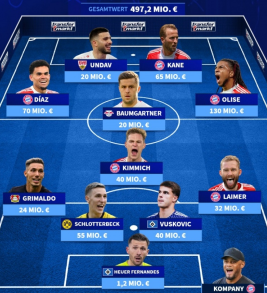 Média nedávno vybrala nejlepší jedenáctku Bundesligy pro první polovinu sezóny, do které se dostalo pět hráčů Bayernu. Brankář: Eul Fernandez (Hoffenheim). Obránci: Grimaldo (Bayer Leverkusen), Schlotterbeck (Dortmund), Vuskovic (Hamburg), Laimer (Bayern). Záložníci: Luis Diaz (Bayern), Kimmich (Bayern), Baumgartner (RB Lipsko), Olise (Bayern). Útočníci: Ondav (Stuttgart), Kane (Bayern). Kane v dres FC Bayern Mnichov pokračuje ve své vynikající formě z minulé sezóny. Doufáme, že Kane, který je s 20 góly na čele žebříčku nejlepších střelců, letos dosáhne skvělých výsledků ve všech soutěžích.
