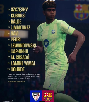 La semifinal de la Supercopa de España arranca con el Barcelona enfrentándose al Athletic de Bilbao. Para clasificarse para la final, ambos equipos utilizaron el esquema 4-2-3-1. Se vio a Yamal, con camisetas de fútbol de portero, saliendo de titular tras recuperarse de una lesión y formando de nuevo un tridente ofensivo con Rafinha y Lewandowski. Nico Williams, que se lesionó durante el entrenamiento, estaba sentado en el banquillo esperando su turno.