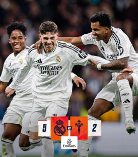 El Real Madrid, jugando en casa, se adelantó en ataque. En el minuto 37, Ceballos asistió y Mbappé remató de volea, marcando su primer gol en la Copa del Rey. En el minuto 48, Díaz realizó un gran pase y Vinicius empujó el balón hacia la portería y el Real Madrid amplió la ventaja a 2-0. En la segunda mitad la defensa del Real Madrid tuvo lagunas, el Celta marcó dos goles seguidos y los dos equipos se fueron a la prórroga. ¡En la prórroga el Real Madrid marcó tres goles seguidos con un excelente ritmo ofensivo! Valverde, con camisetas de fútbol del Real Madrid, marcó un gol de nivel mundial y el Real Madrid derrotó 5-2 al Celta y avanzó a cuartos de final.