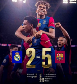 I det 5. minutt slo Vinicius et innlegg fra midtbanen og Mbappe scoret et herlig enkeltskudd, Real Madrid 1-0 Barcelona. I det 22. minutt gjorde Lewandowski et gjennomspill, og Yamal, iført Fotballdrakter, dyttet ballen enkelt i mål, Barcelona 1-1 Real Madrid. I det 33. minutt, etter å ha sett VAR, tildelte dommeren Barcelona en straffe og viste et gult kort til Camavinga. Lewandowski scoret i ett slag, Courtois gjettet retningen, men klarte ikke å få ballen, Barcelona 2-1 Real Madrid. I det 39. minutt slo Konde et innlegg og Rafinha scoret med en heading, Barcelona 3-1 Real Madrid. I det 45+10. minutt scoret Balde med et lavt skudd, og Barcelona ledet Real Madrid 4-1. I det 48. minutt scoret Rafinha, iført FC Barcelona drakt, to ganger og Barcelona slo Real Madrid 5-1. I det 55. minutt vant Real Madrid et frispark i frontbanen og Szczesny ble utvist med direkte rødt kort. I det 60. minutt scoret Rodrigo direkte fra straffemerket, Real Madrid 2-5 Barcelona. I 90+4-minuttet headet Rudiger ballen, men den ble konfiskert av Peña. I det 90+6. minutt ble Mbappes skudd foran 16-meteren igjen reddet av Peña. Kampen tok slutt og Barcelona beseiret Real Madrid igjen. Dette er Flicks første mesterskap som trener.